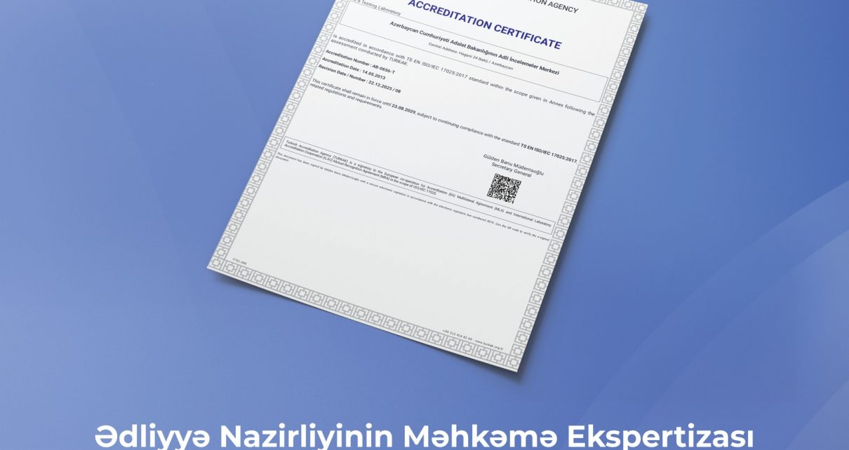Edliyyeinfo.az: Türk Akkreditasiya Qurumunun (TÜRKAK) İdarə Heyətinin 22 dekabr 2025-ci il tarixli qərarı ilə Ədliyyə Nazirliyinin Məhkəmə Ekspertizası Mərkəzinin akkreditasiyası yenilənib. Qərar Mərkəzdə aparılan tədqiqatlarda istifadə edilən metodların standartlaşdırılması və ISO/IEC 17025 “Sınaq və kalibrasiya laboratoriyalarının yetərliliyi üzrə ümumi şərtlər” standartına görə akkreditasiyası prosesinin davamı olaraq audit heyətinin yekun rəyinə əsasən verilib. 2012-ci ildən etibarən […]